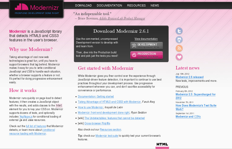 Man möchte natürlich immer das Neueste vom Neuen ausprobieren und nutzen (insbesondere HTML5 und CSS3 aktuell) auf seiner Seite, aber es gibt natürlich viele Browser da draußen die sind älteren Datums. Hier hilft Modernizr weiter Browerfeatures zu erkennen und entsprechend zu handeln. |