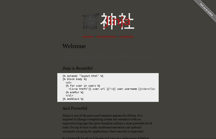 Jinja2 ist eine Template-Engine für Python mit Unicode Support und optionaler Sandbox Integration. Inspiriert wurde das Ganze vom Django Templating System. |