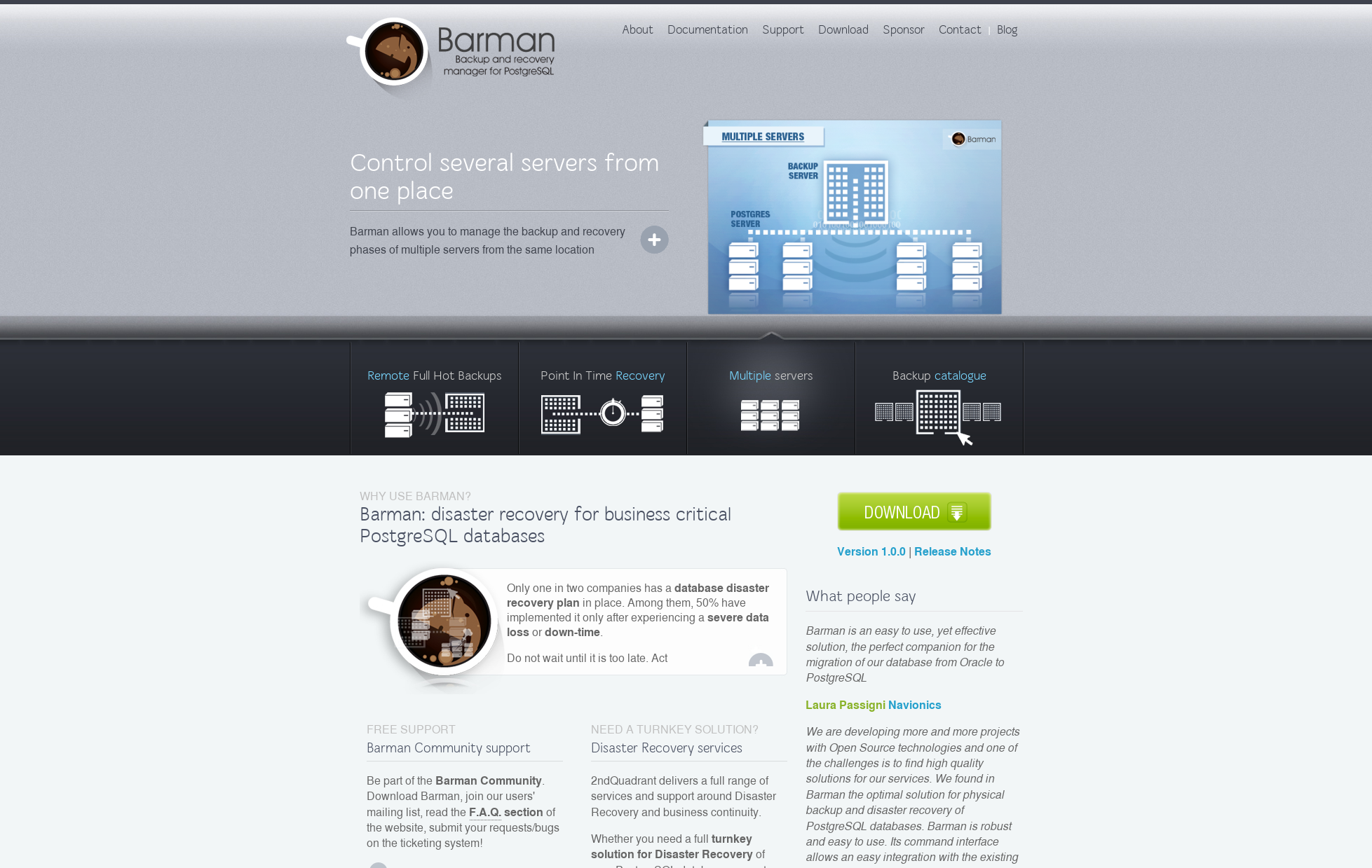 Von 2ndQuadrant stammt dieses Open Source Backup und Recovery Programm für PostgreSQL. Es bietet Remote Backups, Point in Time Recovery, das Managen von mehreren DB-Servern von einem Punkt/Server aus sowie einen Backup-Katalog, mit dem man seine Backups verwalten kann. Das geht schon etwas in Richtung Oracle Rman. |